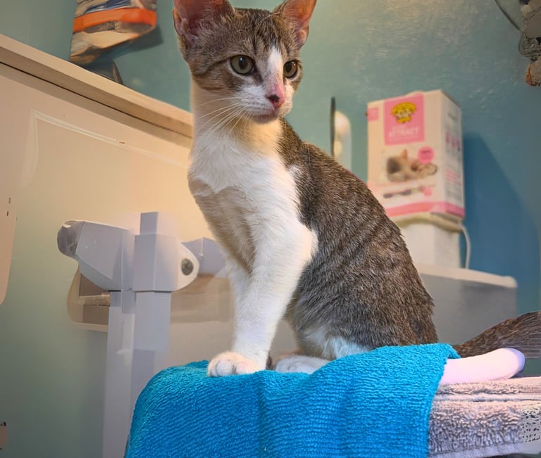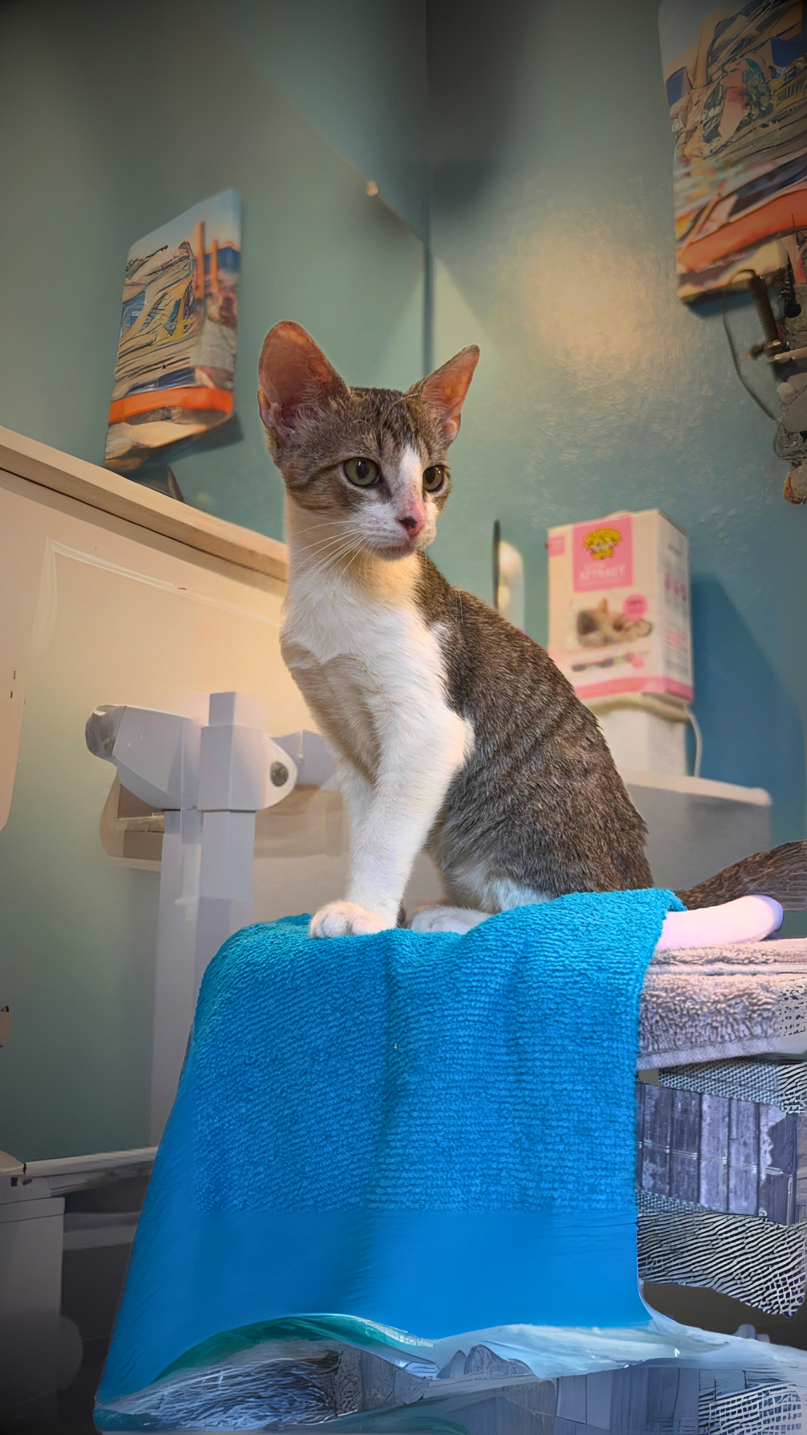 With his soft tan-and-grey tabby coat, bright white markings, and big curious eyes, Memo is as handsome as he is lovable. This 4–5 month-old short-haired sweetheart is a perfect mix of silly and snuggly.