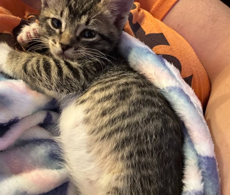 With her soft brown tabby coat, crisp white socks, and bright, curious eyes, Purrsephone is as photogenic as she is lovable. Born June 2025, this charming little kitten is a delightful mix of playful energy and snuggly affection.